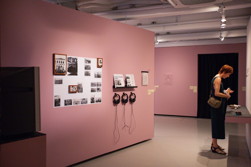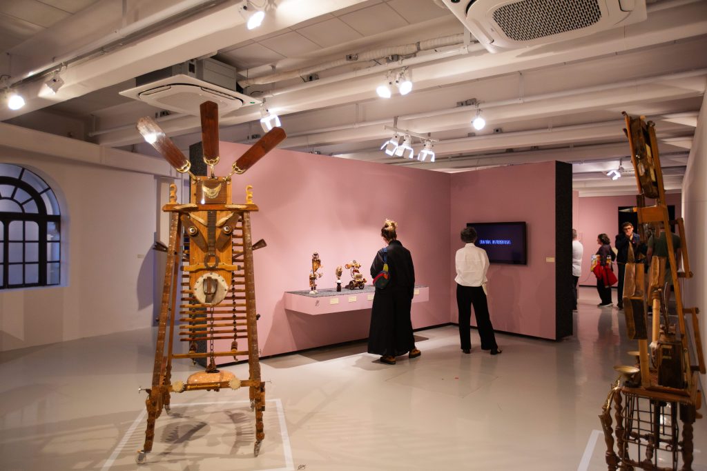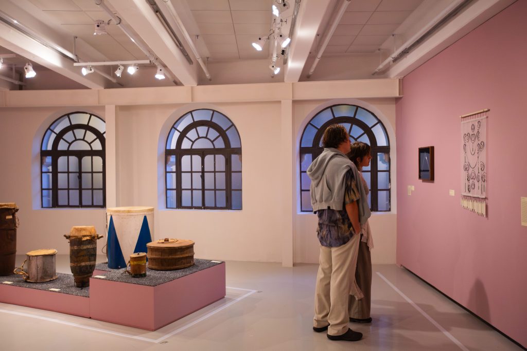 A exposição coletiva “Escuta aqui!” selecionou obras e artistas variados, que pensam suas poéticas através de outras linguagens sonoras, para além das visuais. Entre traquitanas elaboradas e reagrupadas, a mostra conta com as bugigangas sonoras de Adriano Castelo e as máquinas retrofuturistas de Paulo Nenflidio; a partir do barro, há os embriões sonoros de Corcione e, numa referência entre a mística, o lúdico e o popular, a embarcação de Jerona Ruyce. Com estruturas e recursos mais digitais, pode-se conhecer mais do canto do povo tikuna no vídeo interativo produzido por Daniel Lima e adentrar na ambiência sonora e visual proporcionada por Lucas Rampazzo; Vitor Bossa rearranja e embaralha ironicamente a famosa e importante pesquisa musical de Mário de Andrade, enquanto Sara Lana homenageia os percursos de Guimarães Rosa e as conversas populares do sertão. Por fim, Vivian Caccuri e Cildo Mireles nos embalam com os sons de seus triângulos revisitados e outros penduricalhos.